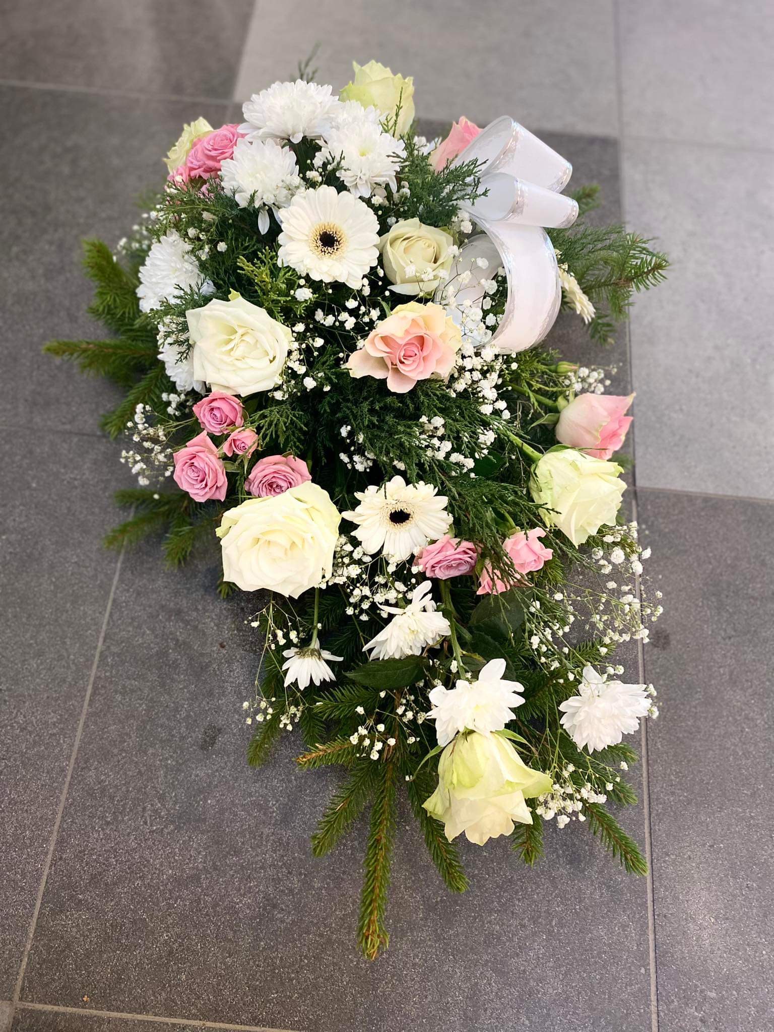 Kaunis leinakimp valge-roosa toonides lilledega.